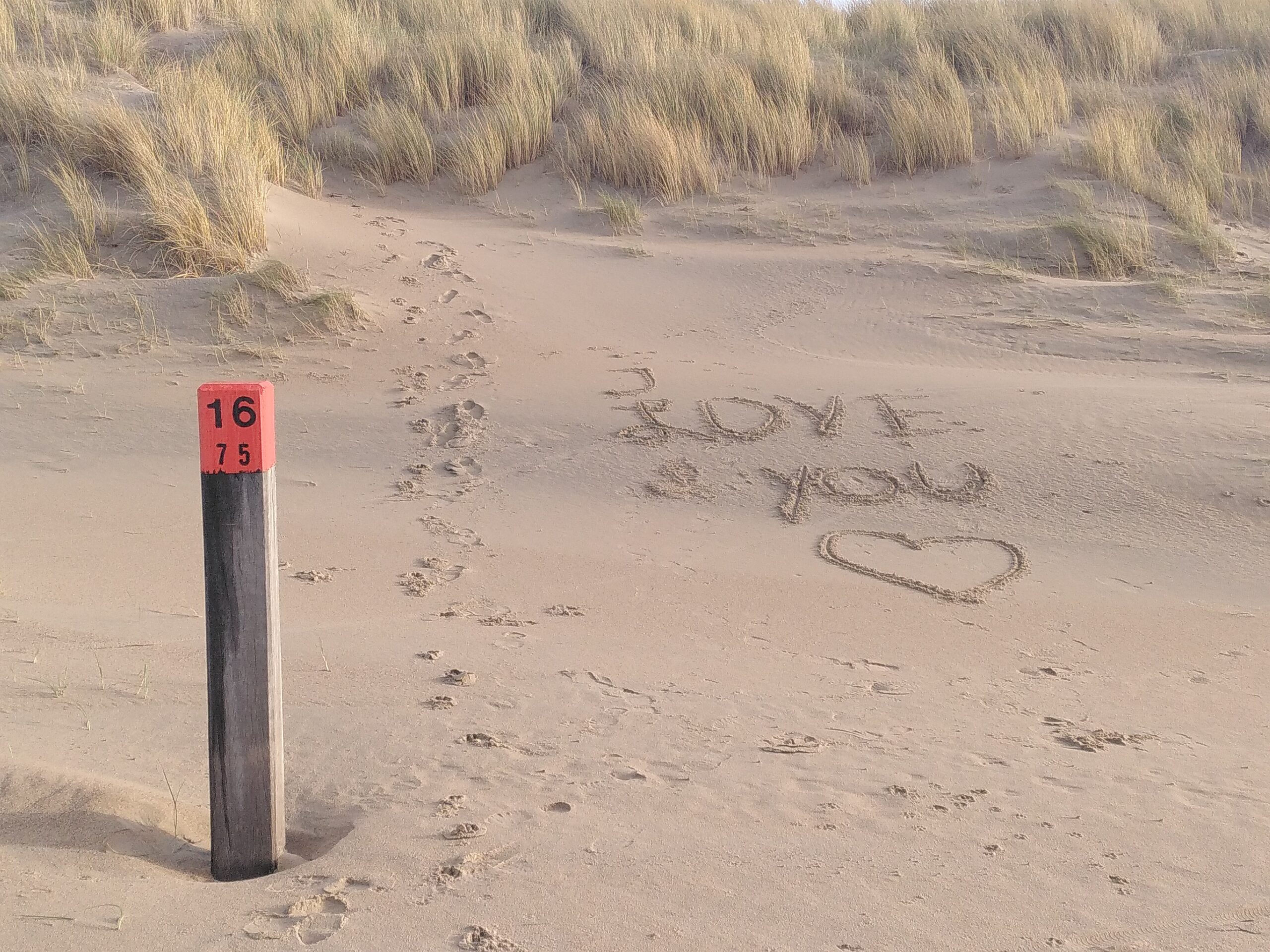 De volgende dag vertrok ik rond kwart over negen voor de laatste wandeling. Weer een mooie zonnige dag met een heerlijke wandeling op het ontzettend brede strand bij Ouddorp. Je waant je bijna in een woestijn, zeker in de ochtend als er nog niet veel andere strandgangers zijn. Onderweg kwam ik het grappige strandvogeltje de drieteenstrandloper regelmatig tegen langs de kustlijn. Na bijna 8 kilometer strand-struinen was daar dan het eindpunt: het Vrijheidsduin(pad), naast strandpaal 16 waar een mooie boodschap* in het zand stond voor…. iedereen!